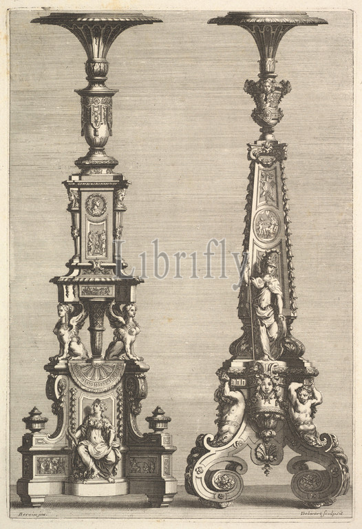 Two Torchères, 1692, Etching and engraving, plate: 11 7/16 x 7 7/8 in. (29 x 20 cm), Juan Dolivar (Spanish, Zaragoza 1641–1692 Paris), After Jean Berain (French, Saint-Mihiel 1640–1711 Paris), Etching and engraving with designs for two torchères, created by Juan Dolivar after designs by Jean I Berain. Entrusted with drawings for costumes, stage sets, and royal ceremonies at the 'Academie Royale de la Musique' since 1680, Berain's ingenious creations took acanthus and laurel leaves, palmettes and grotesques, mixing them with dancers, acrobats, monkeys and satyrs, to create his own, imaginative, theatrical world