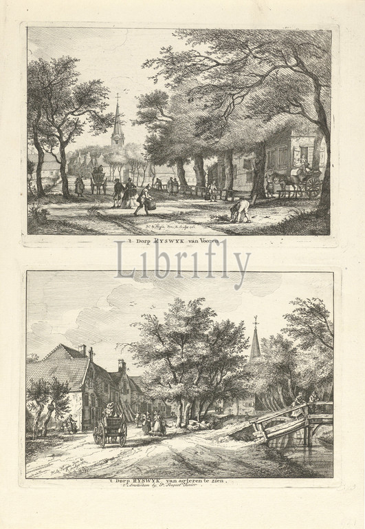Two views, Rijswijk 't Dorp Ryswyk, front, 't Dorp Ryswyk, acting, title, object, Rijswijk village, printed, two plates, village street, figures, church tower, distance, row, houses located, canal, figures walk, far right two figures, bridge, left, figure, cart, Village, canals, waters, village, Rijswijk, South Holland, Paulus Constantijn la Fargue, mentioned, Amsterdam, 1761, paper, engraving