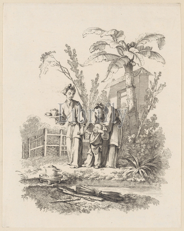 Two Women Leading a Child toward a Teapot on a Table near a Pond, ca. 1742, Etching and engraving, Sheet (trimmed): 11 13/16 × 9 5/16 in. (30 × 23.7 cm), Prints, Gabriel Huquier (French, Orléans 1695–1772 Paris), After François Boucher (French, Paris 1703–1770 Paris)
