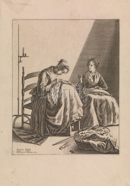 Two Women Sewing, Plate 1, Five Feminine Occupations, ca, 1640–57, Engraving, Plate, 8 3/8 x 6 1/2, 21.2 16.5 cm, Prints, Geertruydt Roghman, Dutch, Amsterdam, 1625–1651/57 Amsterdam, Roghman, Amsterdam family, artists, reproductive prints, original suite, five engravings, Household Tasks, sewing, spinning, reading, cooking, cleaning cookware