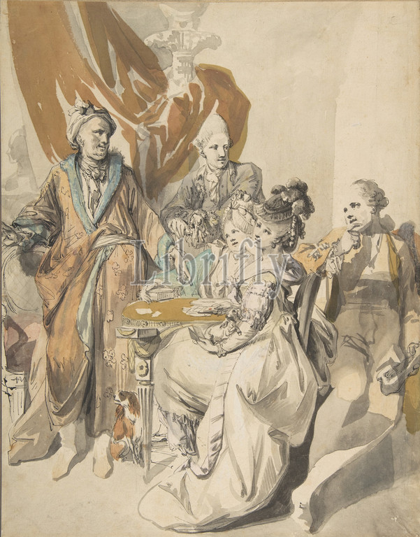 Two Women, Three Men Playing Cards, 18th–early 19th century, Pen, black ink, grey wash, watercolor, sketch, chalk, graphite, sheet, 15 1/16 x 11 3/4, 38.3 29.9 cm, Drawings, Johann Eleazar Zeissig, called Schenau, German, Grossschönau, Gross-Schönau, 1737–1806, Dresden