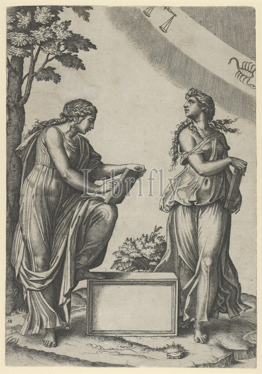 Two women, zodiac standing beneath, signs, Libra, Scorpio, ca, 1517–20, Engraving, heavily reworked, Sheet, 11 1/4, 7 7/8, 28.6, 20 cm, Prints, Marcantonio Raimondi, Italian, Argini, ca., 1480–before, 1534, Bologna, After Raphael, Raffaello Sanzio or Santi, Urbino, 1483–1520, Rome