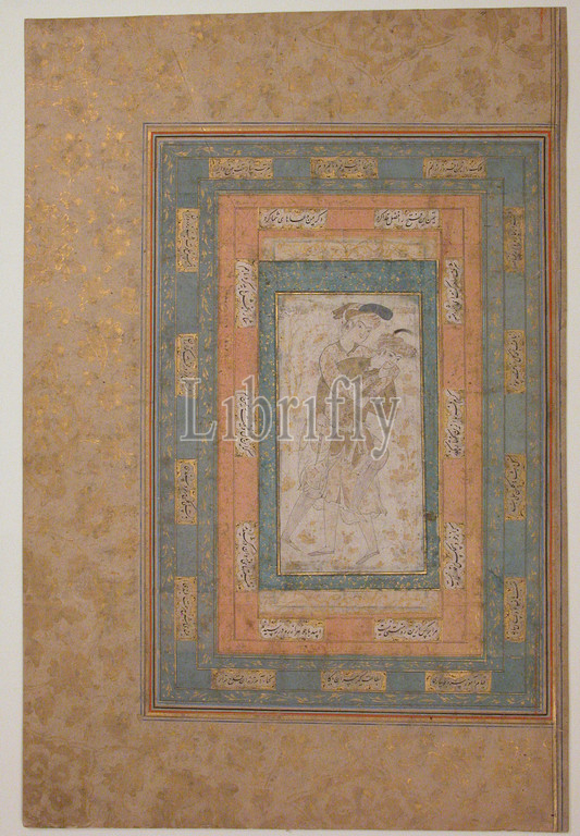 Two Youths Romping, late 16th century, Attributed, Iran, Ink, pencil, opaque watercolor, gold, paper, 15.62, high 10.37, wide, 39.7 cm high 26.3 wide, Codices, line, drawing, tinted, greenish tan, depicts two, youths, playing, frolicking, boy grasping, figures wear, small, turbans, gold highlights, tassel, blue appendage, garments decorated, floral motifs