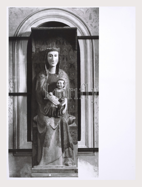 Umbria Perugia Pale Parrocchiale, this is my Italy, the italian country of visual history, Medieval Sculpture. Polychromed wooden statue of the Madonna and Child a work of the Umbrian school from the first half of the 14th century. Post-medieval Architecture, sculpture, painting. In a side altar is placed a painting of the Madonna and Child with saints, dated to 1584 and signed by Felice Damiani