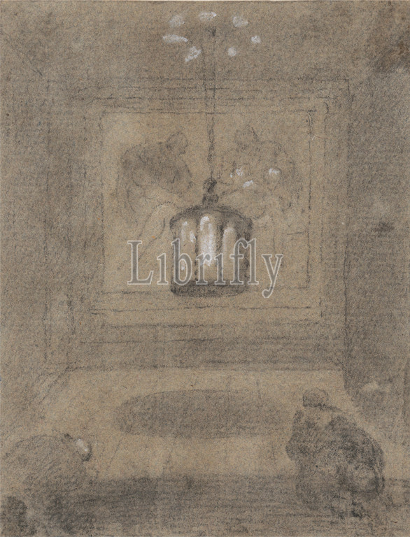 Underground Shrine, Two Figures Kneeling, Pieta, Richard Wilson RA, 1714–1782, British, active, Italy, 1750–56, Graphite, watercolor white gouache, moderately thick, moderately textured, cream laid paper, Sheet, architectural subject, chandelier, kneeling, lamp, painting, visual work, people, pieta, prayer, sculpture, shrine