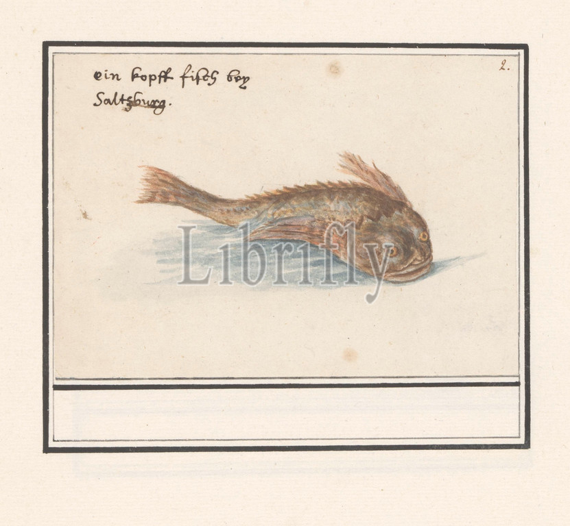 Unknown fish, An unidentified fish. According to the inscription a 'kopfffisch' caught near Salzburg. Numbered top right: 2. Part of the sixth album with drawings of fish, shells and insects. Sixth of twelve albums with drawings of animals, birds and plants known around 1600, commissioned by Emperor Rudolf II. With explanations in Dutch, Latin and French, bony fishes, Anselmus Boetius de Boodt, 1596 - 1610, paper, pencil, chalk, watercolor (paint), deck paint, ink, pen, h 105 mm × w 151 mm