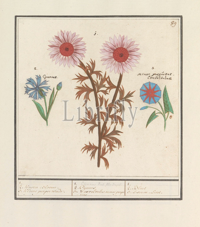 Unknown flower, cornflower, Centaurea cyanus, bindweed, Convolvulaceae, 1, 2, Koorn Bloeme, 3, Kleen purple bindweed, Cyanus 3, Convolvulus minor purpureus, Bluet 3, Liseron, Liset, title, object, Unknown pink flower, purple bindweed, Numbered top right, 89, Latin name, Part, first album, drawings, flowers, plants, Eighth, twelve albums, animals, birds, 1600, commissioned, Emperor Rudolf II, explanation, Dutch, Latin, French, NAME, Anselmus Boetius de Boodt, 1596, 1610, paper, watercolor, paint, deck paint, chalk, ink, pen