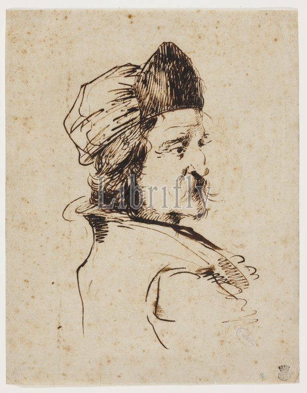 Unknown, Italian, Head, Man Wearing, Cap, ca. 1650, gouache, watercolor, pen, black, brown ink, preliminary drawing, graphite, decorative border, black ink, buff antique laid paper, Sheet, 9 3/16