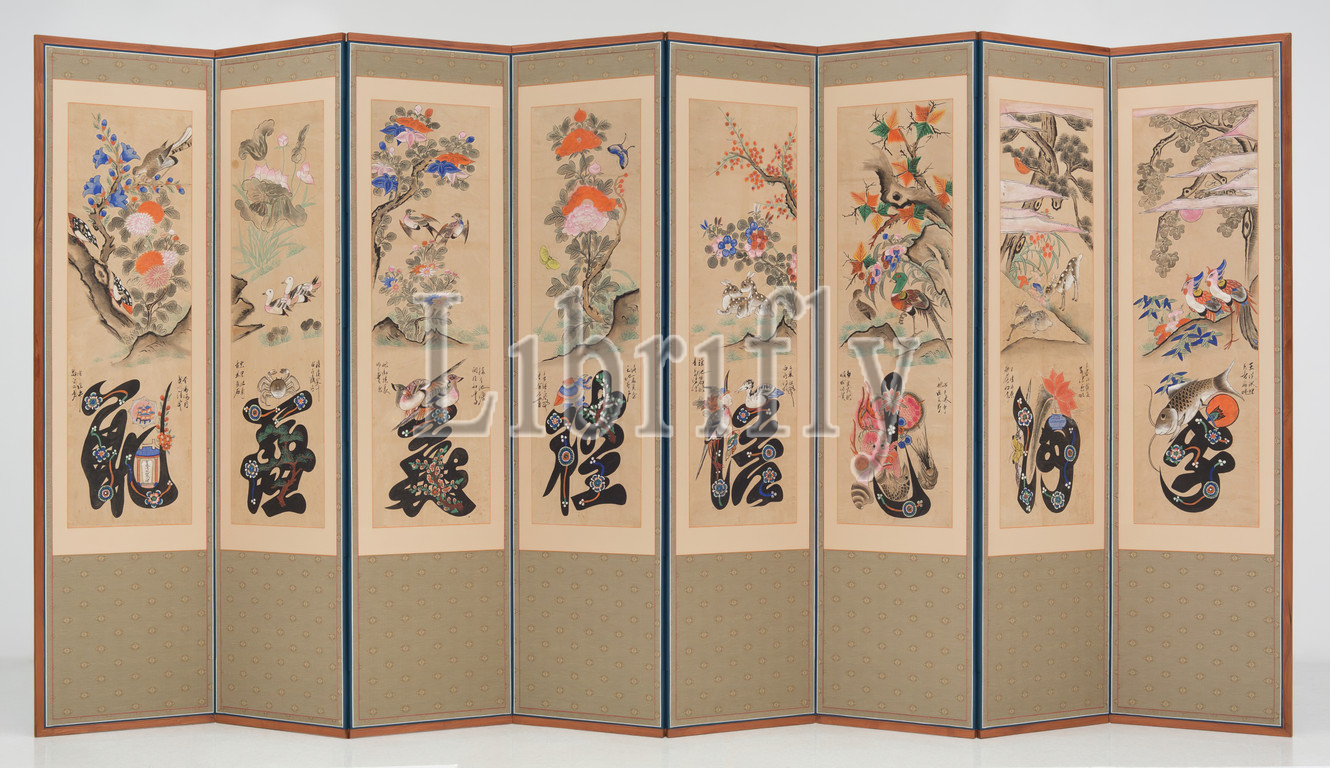 Unknown (Korean), Munjado with Flowers and Birds, 19th century, Ink and watercolor on paper, Block (Each panel): 44 1/2 × 13 3/8 inches (113 × 34 cm)