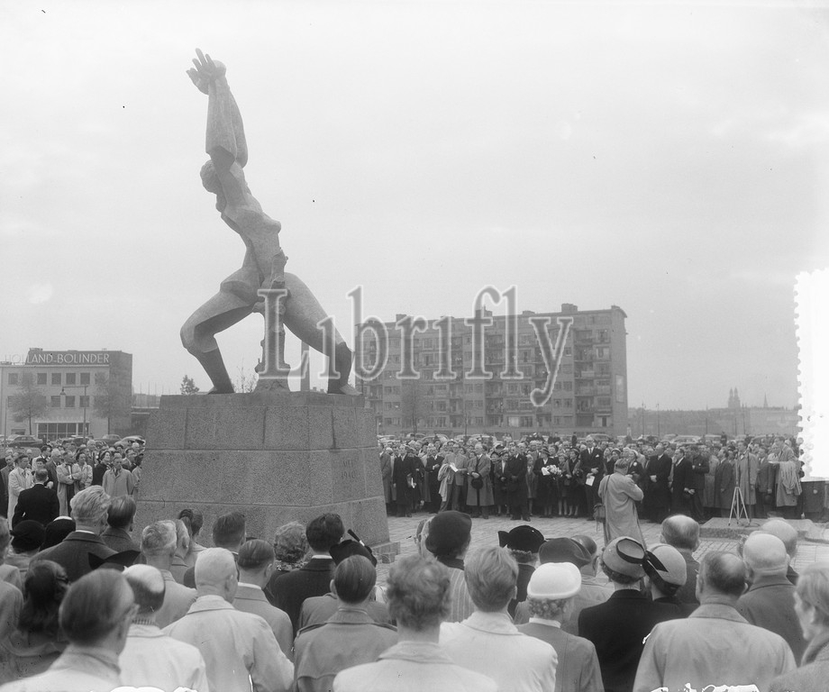 Unveiling by Mrs. van Walsum of the statue of Zadkine in Rotterdam, May 15, 1953, sculptures, unveilings, The Netherlands, 20th century press agency photo, news to remember, documentary, historic photography 1945-1990, visual stories, human history of the Twentieth Century, capturing moments in time