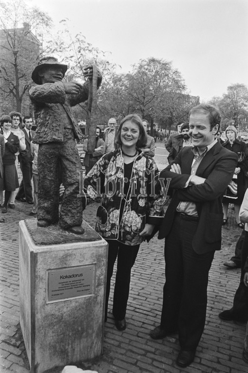 Unveiling statue, Kokadorus, Amstelveld, alderman Treumann, statue, alderman Treumann, sculptress Erica van Eeghen, October 13, 1977, statues, sculptors, aldermen, Netherlands, 20th century, press agency photo, news to remember, documentary, historic photography, 1945-1990, visual stories, human history, Twentieth Century, moments in time