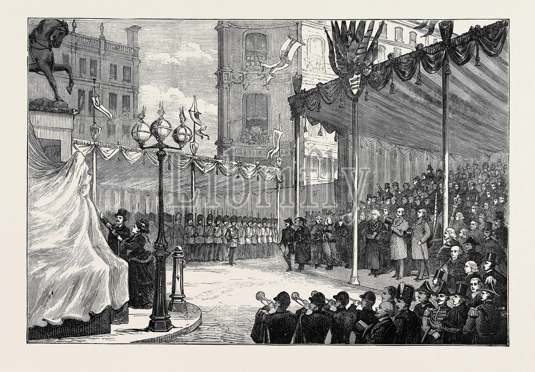 unveiling, sculpture, monument, statue, prince consort, holborn, company of performers, circus, london, 1874, uk, 1874 engraving, engraved image, history, illustrative technique, engravement, victorian, arts, culture, retro styled, vintage, retro, arkheia
