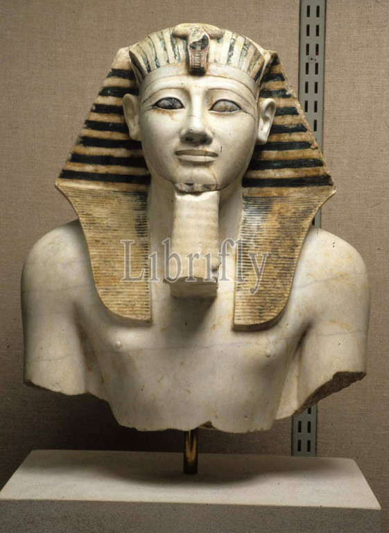 Upper part of a statue of Thutmose III, New Kingdom, Dynasty 18, ca. 1479–1425 B.C., From Egypt, Upper Egypt, Thebes, Deir el-Bahri, Temple of Mentuhotep II, Egypt Exploration Fund excavations, Indurated limestone, H. 42.6 cm (16 3/4 in.), This fine indurated limestone torso and head was uncovered in the early Twentieth Century during excavations conducted by Edouard Naville at the mortuary temple of Mentuhotep II at Deir el-Bahri. The face, which had brocken off in antiquity, was discovered in the 1960s by Polish excavators who were clearing the destroyed temple of Thutmose III which is adjacent to Mentuhotep's temple
