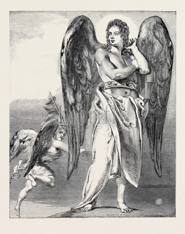 uriel, Devil, satan, painted, haydon, display of works of art, exhibition, royal, academy, 1845 engraving, engraved image, history, illustrative technique, engravement, victorian, arts, culture, retro styled, vintage, retro, arkheia