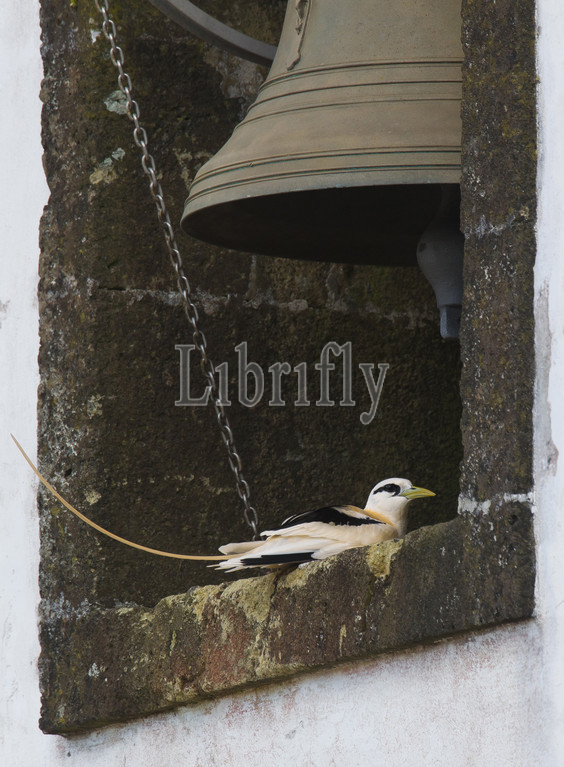 Vagrant White-tailed Tropicbird on the Azores resting in church tower, Phaethon lepturus, Azores, Portugal