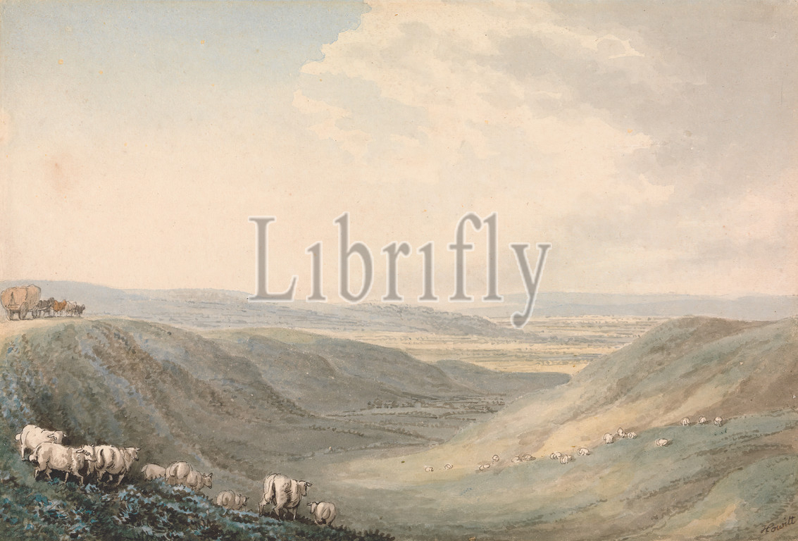 Valley Landscape, Sheep, Samuel Howitt, 1756–1822, British, Watercolor, pen, black ink, graphite, medium, slightly textured, cream wove paper, Sheet, horses, animals, landscape, sheep, valley, landform, wagon