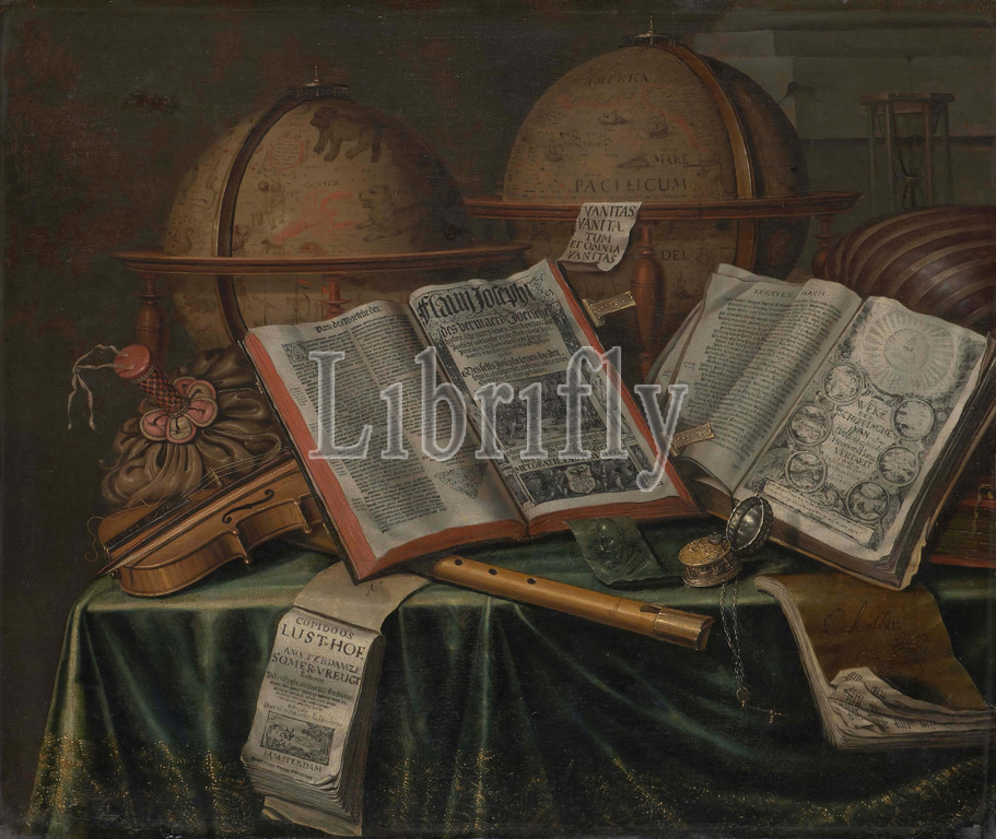 Vanitas still life, painting, Edwaert Collier, second half of the 17th century, Signature front: lower right, on music book: E. Kollier, canvas, oil paint, painted, Carrier: 50.9 × 61.4 × 2.4cm (509 × 614 × 24mm), With Frame: 67.5 × 77.5 × 8.7cm (675 × 775 × 87mm), flute, violin, hourglass, book, globe, vanitas, Vanitas covered with a green cloth table with a celestial globe on the left and a globe on the right. There are two open books in front of this: on the left Flavi Josephi, the astonished Joetsche histori writers live ... Antwerp 1501 and on the right De Weke der Creatiehe by Willem de Salust ... 1622. On a piece of paper on the globe: Vanitas vanitatum et omnia vanitas. More to the right a lute and an hourglass. On the left a bundle of money and a violin, more to the center a flute, a drawing of a man's head, a watch and a booklet Cupidoos pleasure garden Amsterdamze Somervreugt .... On the right a music booklet. Signed on the music book. The painting is in a gilded wooden frame and is behind glass, 1895