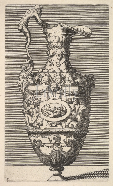 Vase with a River God in an Oval Medallion, 17th century, Engraving, Sheet: 10 7/16 x 7 1/8 in. (26.5 x 18.1 cm), Depiction of a vase or ewer. The vase is caracterized by an abundance of motifs from the Fontainebleau School. In the center an oval medallion with a river god is placed. The handle is shaped like a satyr