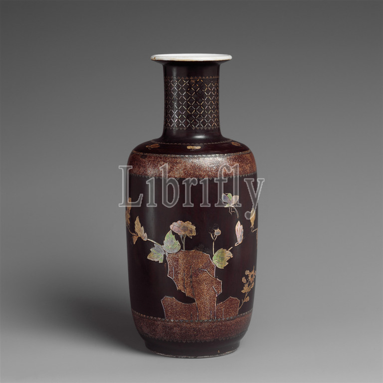 Vase, Rock, Flowers, Butterflies, Qing dynasty, 1644–1911, Kangxi period, 1662–1722, China, Black lacquer, porcelain, inlaid, mother, pearl, H, 2 3/4, 7 cm, Diam, 8 1/4, 21, Ceramics, decorating, lacquer, pearl exemplifies, inventiveness, Chinese art, mid-seventeenth, early eighteenth, century, vase, marked, shape, common, works produced, reign, emperor