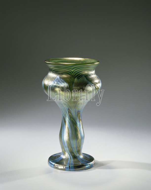 Vase, black-and-white colored threads, black-and-white colored iridescence, light green background, Flat, concave ground, middle, flat foot, middle swelling stem, ends, calyx, bent edge, Light green glass, black-and-white colored, rolled, combed threads, black-and-white colored iridescent, Marked, underside, wheel engraving, Loetz Austria, Witwe Johan Lötz, Klostermühle, c, 1901, 1903, glass, iridescence