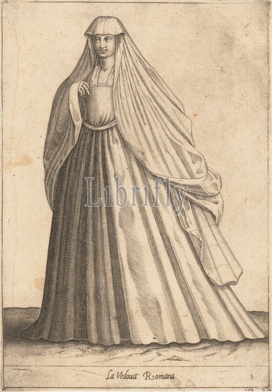 La Vedova Romana, ca. 1580, Engraving, Sheet: 8 15/16 x 6 1/4 in. (22.7 x 15.9 cm), Prints, Attributed to Pietro Bertelli (Italian, active Padua, ca. 1571–1621)