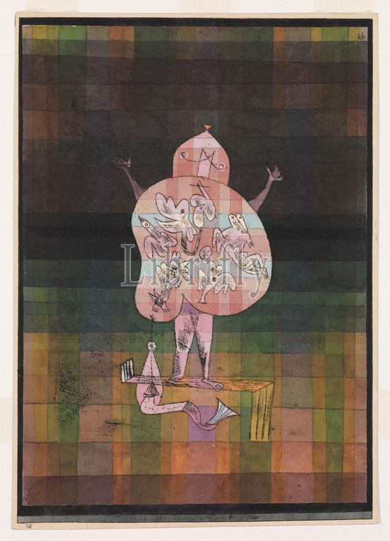 Ventriloquist, Crier, Moor, 1923, Watercolor, transferred printing ink, paper, bordered, ink, mounted, cardboard, 16 1/2, 11 5/8, 41.9, 29.5 cm, Drawings, Paul Klee, German, born Switzerland, Münchenbuchsee, 1879–1940, Muralto-Locarno, Imaginery beasts, float, within, transparent ventriloquist, belly-except, course, pair, legs, tiny arms, sort, head, mouth, little creatures, inside, ventriloquist might, symbolize, odd noises, voices, emanate