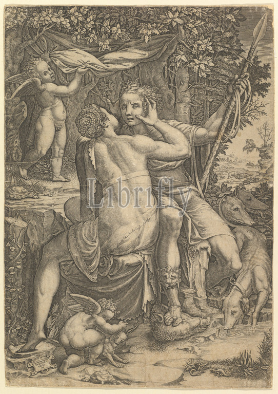 Venus, Adonis, ca, 1570, Engraving, sheet, 12 7/16 x 8 3/4, 31.6 22.2 cm, borderline, Prints, Giorgio Ghisi, Italian, Mantua ca., 1520–1582, Mantua, After Teodoro, 1536–1601