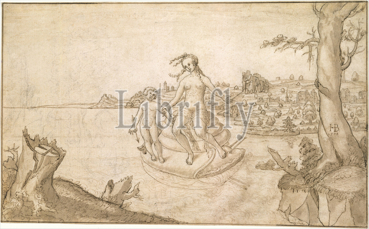 Venus, Cupid, Snail, 1538, Pen, brown ink, gray brown wash, preliminary drawing, black chalk, charcoal, 8 7/8 x 14 3/8, 22.5 36.5 cm, Drawings, Copy after Hans Brosamer, German, active by, 1536, probably, died, 1552