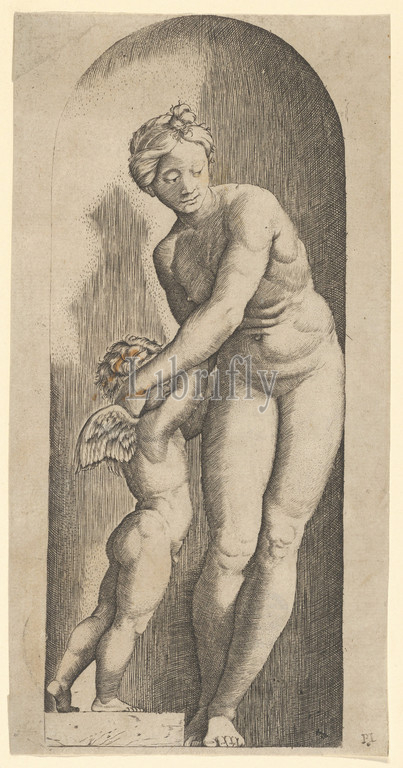 Venus, Cupid standing, niche, ca, 1500–1527, Engraving, Sheet, 8 1/16, 4 1/8, 20.4, 10.5 cm, Prints, Marcantonio Raimondi, Italian, Argini, ca., 1480–before, 1534, Bologna