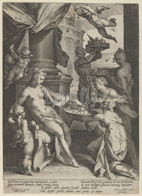 Venus Honored by the Nymphs, ca. 1591, Engraving, Sheet: 11 1/8 × 7 7/8 in. (28.2 × 20 cm), Prints, Jan Muller (Netherlandish, Amsterdam 1571–1628 Amsterdam), After Bartholomeus Spranger (Netherlandish, Antwerp 1546–1611 Prague)