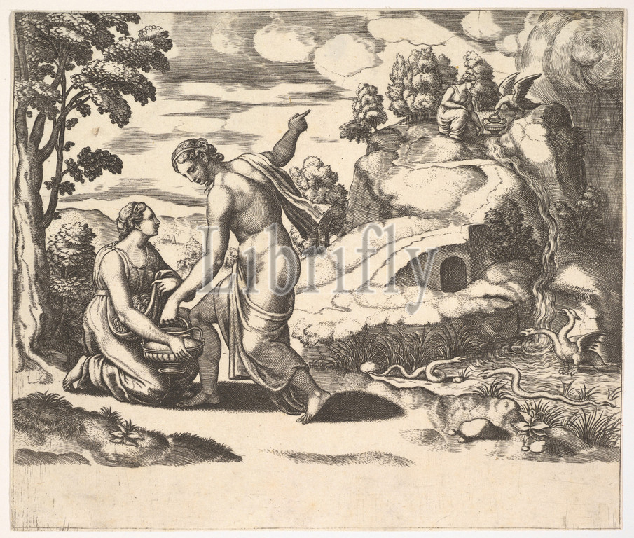 Venus ordering Psyche, take water, fountain guarded, dragons, Fable, Cupd, Psyche, 1530–60, Engraving, Sheet, 8 13/16, 22.4 cm, Prints, Master of the Die, Italian, active Rome, ca.