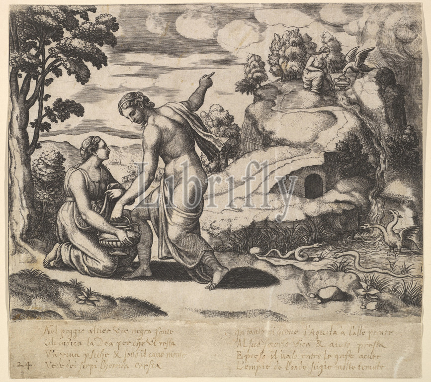 Venus ordering Psyche, take water, fountain guarded, dragons, Fable, Cupd, Psyche, 1530–60, Engraving, Sheet, 7 3/4, 8 1/2, 19.7, 21.6 cm, Prints, Master of the Die, Italian, active Rome, ca., Michiel Coxie, I, Netherlandish, Mechelen ca., 1499–1592, Mechelen
