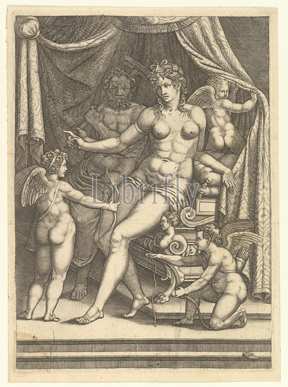 Venus and Vulcan Seated on a Bed and Three Putti, mid-1550s, Engraving, plate: 11 1/4 x 8 1/8 in. (28.6 x 20.7 cm), Prints, Giorgio Ghisi (Italian, Mantua ca. 1520–1582 Mantua), After Perino del Vaga (Pietro Buonaccorsi) (Italian, Florence 1501–1547 Rome) ?