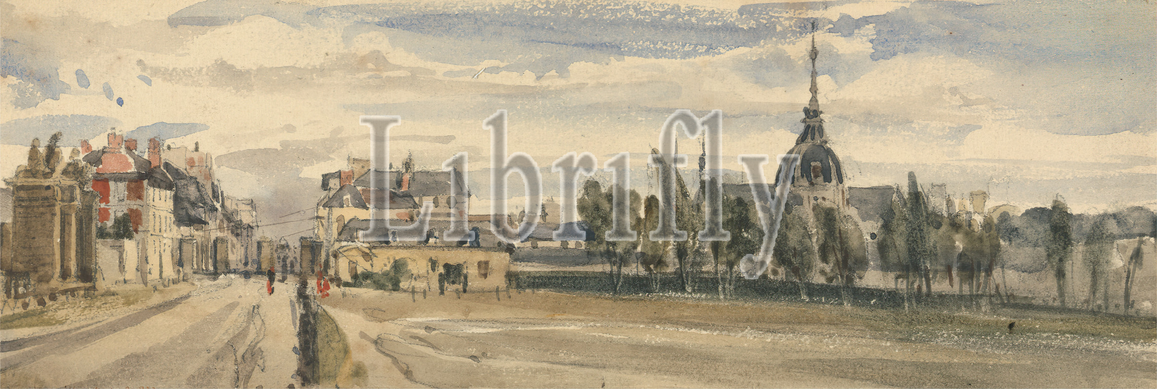 Versailles, William Callow, 1812–1908, British, active in France, 1833, Watercolor with pen in brown ink, with graphite on cream, medium, slightly textured, wove paper, Sheet: 3 1/4 × 9 1/2 inches (8.3 × 24.1 cm), architectural subject, buildings, gate, landscape, road, sky, steeple, trees, Europe, France, Versailles