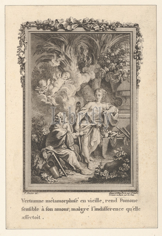 Vertumnus Transforms Himself, Old Woman, Attempts, Woo Pomona, Les Métamorphoses d'Ovide en Latin et François de la traductio, l'Abbé Banier l'Académie Royale des Inscriptions Belles-Lettre, Avec explications historiques, Paris Chez Despilly rue saint Jacques à croix d', MDCCLXVII, Approbation Privilège du Roi, ca, 1765, Etching, engraving, third state, three, Bocher, Sheet, 7 5/8, 5 3/16, 19.4, 13.1 cm, Prints, Jean Leveau, French, 1729–1786, Augustin Saint-Aubin, Paris, 1736–1807, After Boucher, 1703–1770
