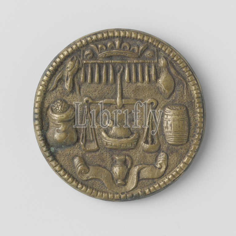 Vettewariers guild, Middelburg, funeral medal, no, 64, Brass medal, Front, crowned, balanced hanging scales under, stick, candles, two hams hang, left, bag, right, barrel, butter tub, jug, ear, ribbon, number 64 within, dashed edge, Reverse, apparently, cloth hangs adorned, cartouche, year inside, circle, 1618, brass, alloy, engraving