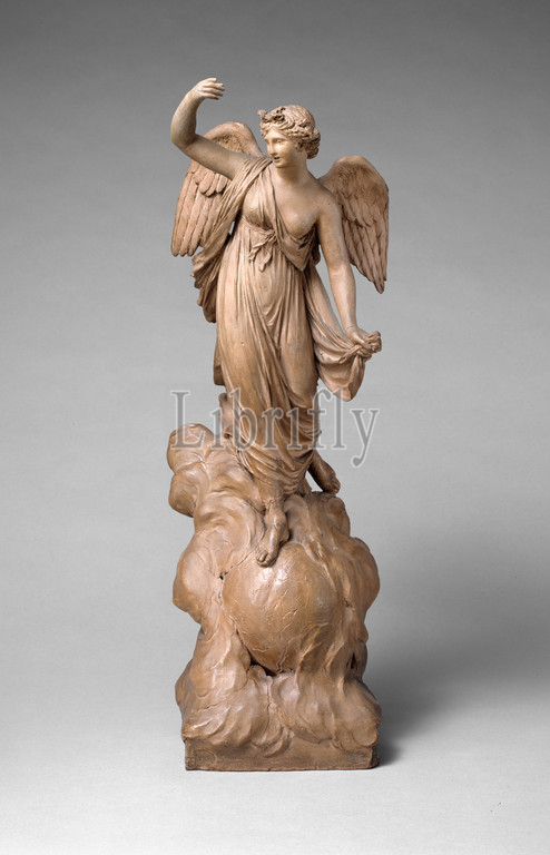 Victory Alighting, Earth, 1809, Belgian, Brussels, Terracotta, Height, 21 5/8, 54.9 cm, Sculpture, Gilles-Lambert Godecharle, Belgium, 1750–1835, Paris-trained, Godecharle, important Neoclassical, sculptor, enchanting statuette, served, model, relatively stolid, marble, statue, stands, niche, royal palace, Laeken