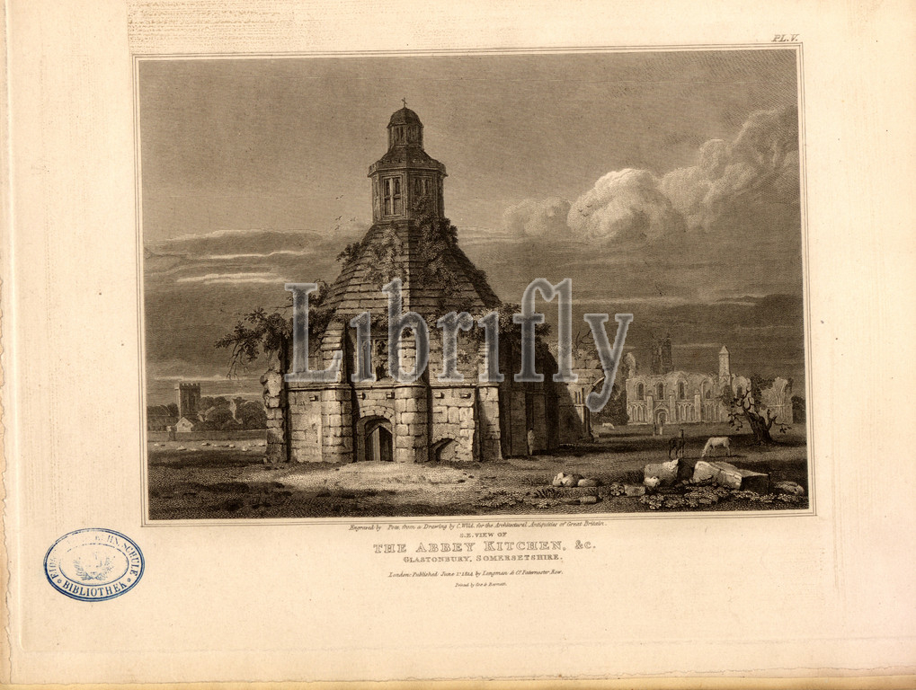 S. E. view of the Abbey Kitchen, Abbot's Kitchen, Glastonbury Abbey, Somerset, Engraved by Pote, from a Drawing by C. Wild; Published b Longman & Co, Fig. 76, Pl. V, after p. 196, Wild, Charles (drawing); Pote (engraver); Longman & Co. (published), 1814, John Britton: The architectural antiquities of Great Britain: represented and illustrated in a series of views, elevations, plans, sections and details of various ancient English edifices: with historical and descriptive accounts of each. Bd. 4. London: J. Taylor, 1807-1826