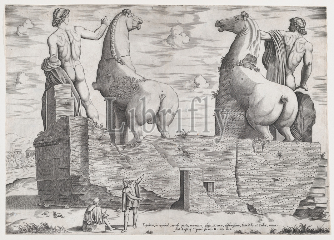 View, Back, Statues, Dioscuri, Quirinal, 1550, Engraving, sheet, 13 11/16 x 19 5/16, 34.7 49 cm, Prints, Anonymous, Published, part, Antonio Lafreri, Speculum Romanae Magnificentiae, Mirror, Roman Magnificence, individuals, purchased, prints, Lafreri, own selections, bound