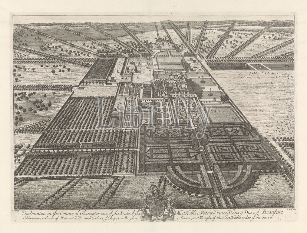 View, Badminton Estate Badminton, Country, Gloucester, Seats, Noble & Potent Prince Henry Duke, Beaufort, Marquesse & Earle, Worcester, title, object, Britannia Illustrata, series title, Bird's eye view, Badminton' estate, Duke, part, gardens, farmlands, foreground, castle, middle, Various figures, deer, animals, estate, margin, family crest, duke, print, series, royal castles, England, garden, Johannes Kip, mentioned, 1709, paper, engraving