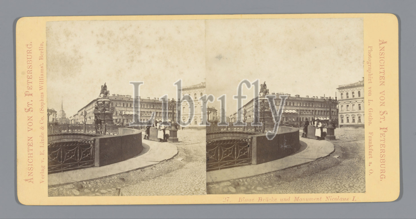 View of the Blue Bridge and the equestrian statue of Nicholas I of Russia in St. Petersburg Blaue Bridge and Monument to Nicolaus I. (title on object), bridge across city river, canal, etc, equestrian statue, St. Petersburg, L. Gothe (mentioned on object), Berlin, c. 1850 - c. 1880, cardboard, photographic paper, albumen print, h 85 mm × w 170 mm
