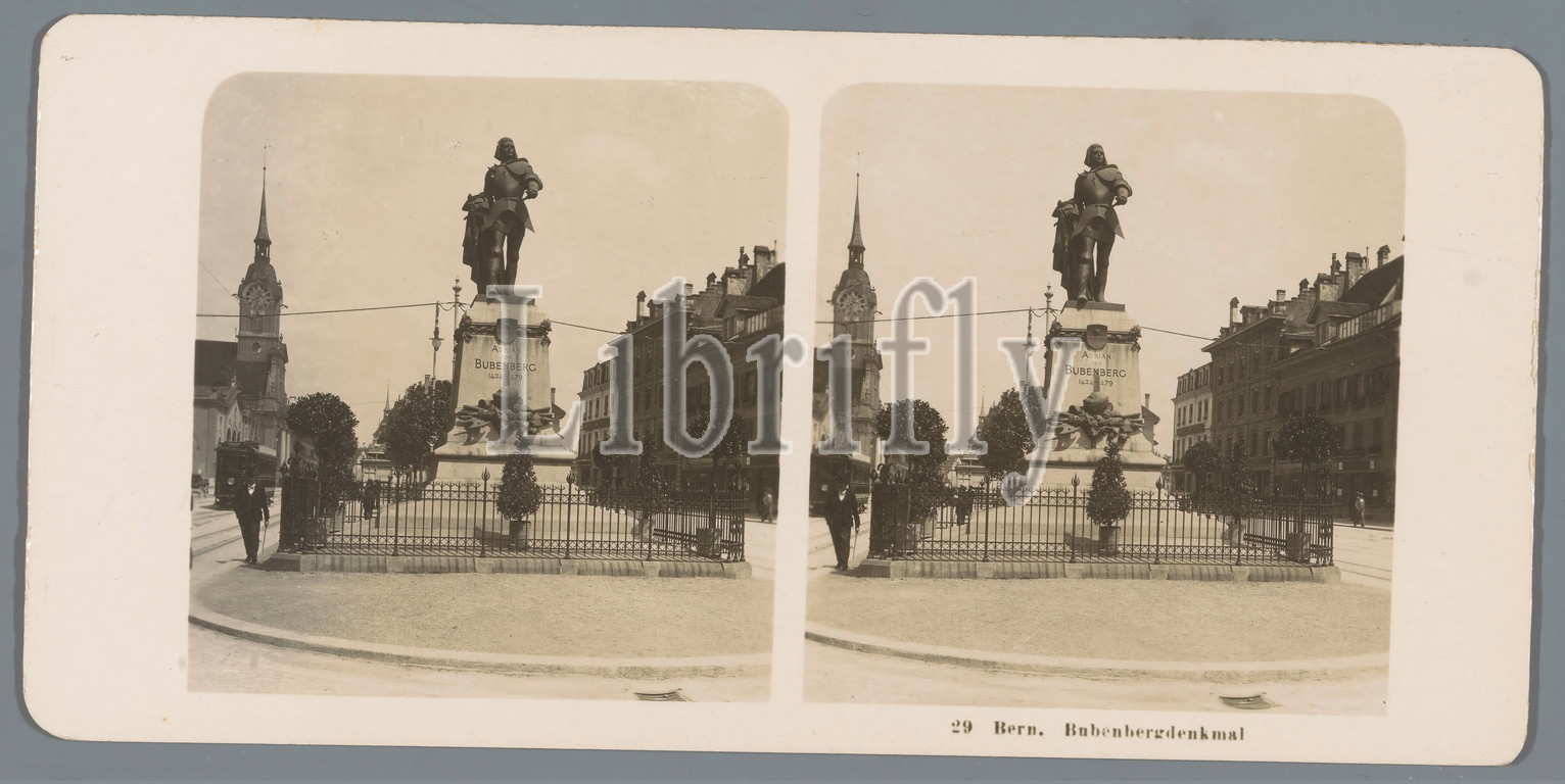 View, Bubenberg-Denkmal, Bern Bern, Bubenbergdenkmal, title, object, sculpture, monument, statue, Neue Photographische Gesellschaft, mentioned, Bern, 1906, cardboard, photographic paper, gelatin black-and-white print