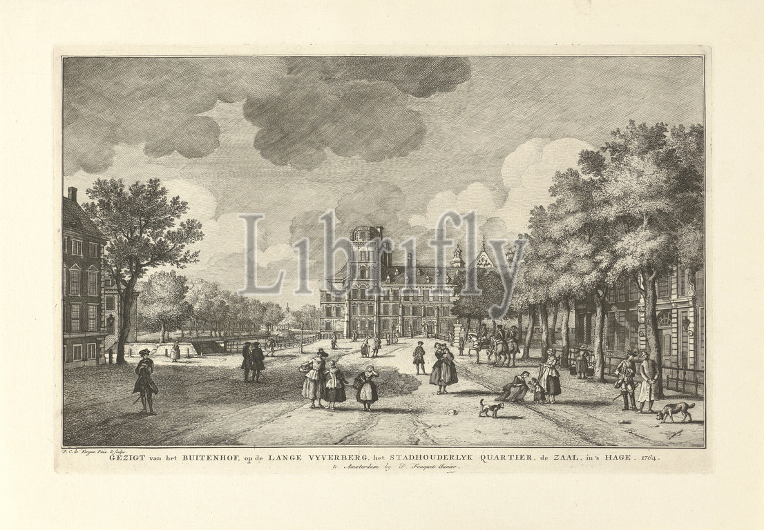 View, Buitenhof, Hague, Lange Vyverberg, Stadhouderlyk Quartier, Hall, Eight faces, series title, Het Buitenhof, towards, Stadhouderlijk Kwartier, center, Hofvijver, Lange Vijverberg, left, right, Logement van Leiden, walking figures, soldiers, Print, series, eight faces, City view, landscape, man- constructions, pound, pool, square, place, circus, etc, city-scape, figures, staffage, Vijverberg, Paulus Constantijn la Fargue, mentioned, object, 1764, paper, engraving