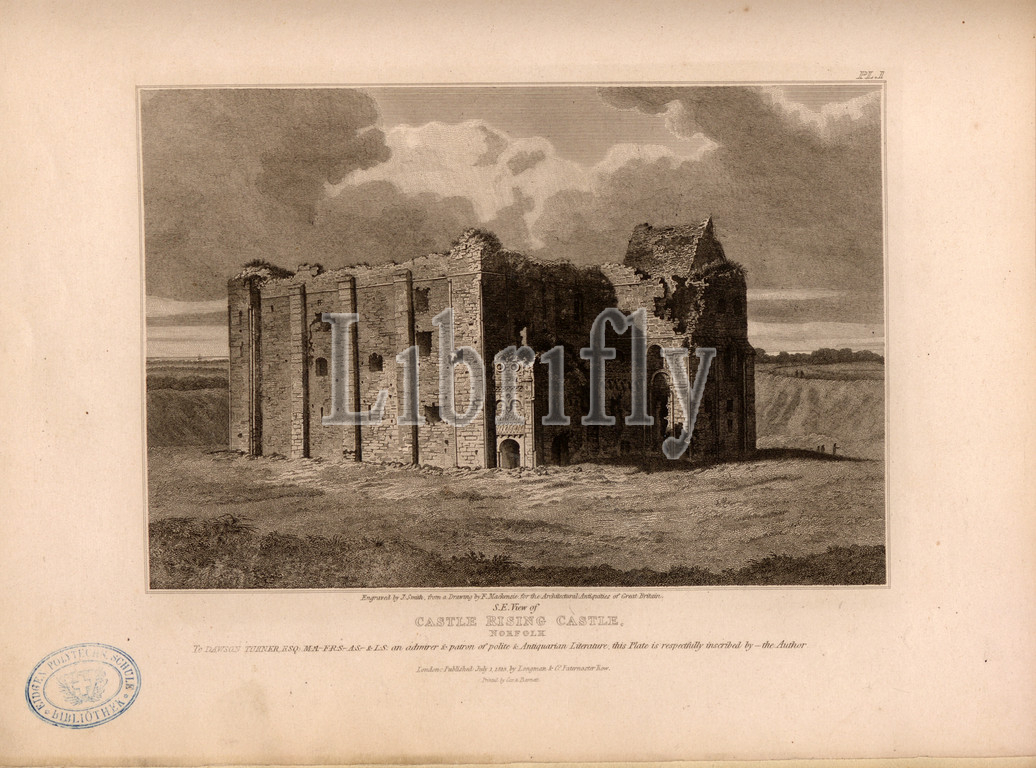 S. E. view of Castle Rising Castle, Norfolk, Ruin of Castle Rising Castle in Norfolk, signed: Engraved by J. Smith, from a Drawing by F. Mackenzie; Published by Longman & Co, Fig. 56, p. 159, Mackenzie, F. (drawing); Smith, John (engraving); Longman & Co. (published), 1814, John Britton: The architectural antiquities of Great Britain: represented and illustrated in a series of views, elevations, plans, sections and details of various ancient English edifices: with historical and descriptive accounts of each. Bd. 4. London: J. Taylor, 1807-1826