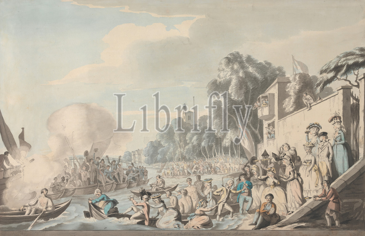 View, Chelsea, Annual Sculling Race, Doggett's Coat, Badge, Edward Francis Burney, 1760–1848, British, Watercolor, pen, black ink, gray ink, graphite, medium, slightly textured, blued white, laid paper, Sheet, badge, boats, bridge, built work, buildings, coat, crowd, landscape, men, people, race, event, sculling, sporting art, trees, wall, water, women, Chelsea, England, Europe, Greater London, United Kingdom