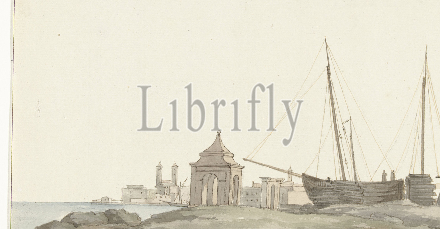 View, city, Molfetta, coast, Vue de la ville de Molfetta du côte de la Mer, Voyage en Italie, en Sicile et à Malte, 1778, series title, Drawing, album 'Voyage en Italie, en Sicile et à Malte', 1778, draughtsman, Louis Ducros, 1778, paper, chalk, brush, height 143 mm, width 275 mm