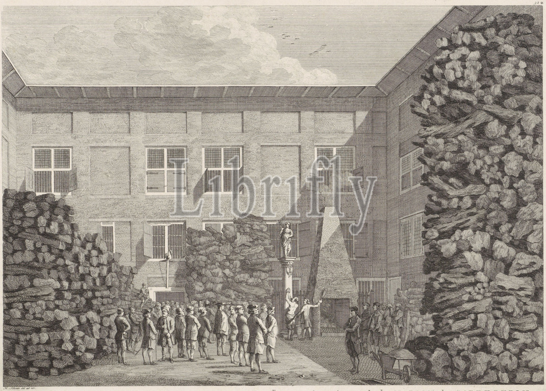 View, courtyard, Rasphuis, Amsterdam, Hermanus Petrus Schouten, Hermanus Petrus Schouten, c, 1770 - 1783, View, courtyard, Rasphuis, Amsterdam, stacks, wood, men watch, prisoner, given, rod under, statue, Justitia, scene, title, Latin, Dutch, Numbered, upper right corner, 32*, print maker, Hermanus Petrus Schouten, intermediary draughtsman, Hermanus Petrus Schouten, mentioned, object, publisher, Pierre Fouquet, mentioned, object, Amsterdam, c, 1770 - 1783, paper, etching, engraving, h 280 mm × w 379 mm