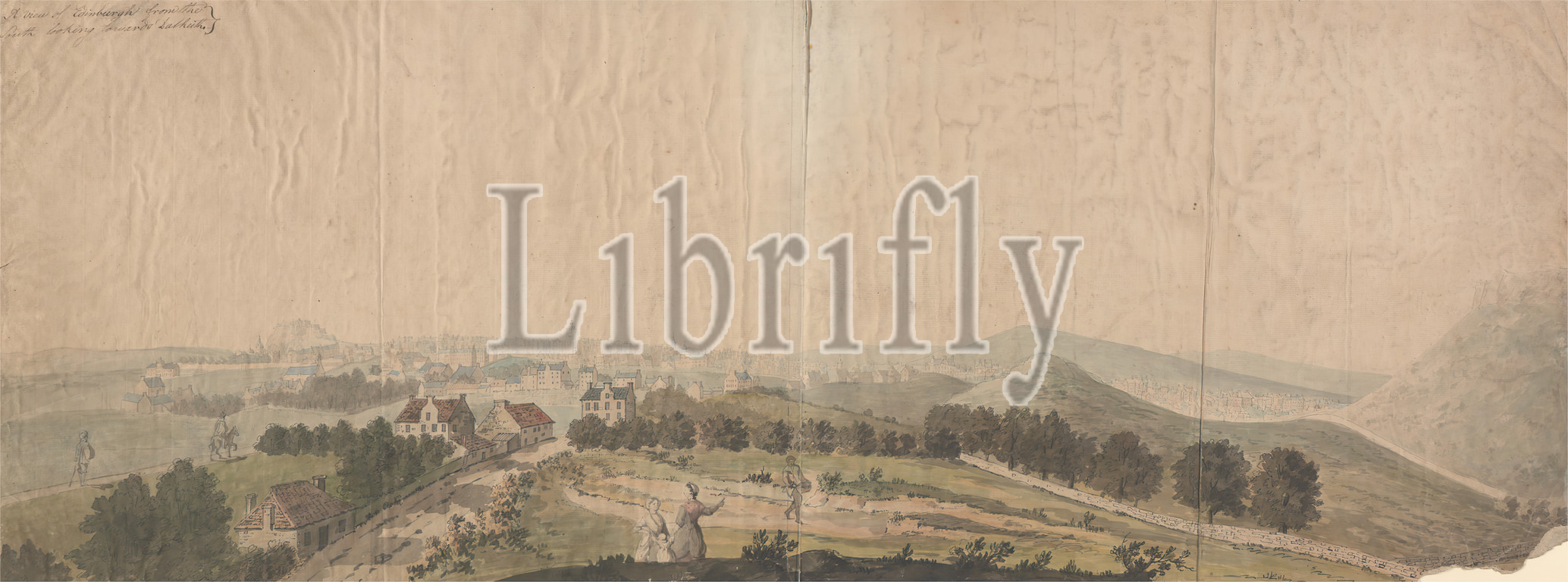 A View of Edinburgh from the South Looking towards Dalkeith, Samuel Scott, 1701/2–1772, British, undated, Watercolor, graphite and pen and black ink on medium, slightly textured, cream laid paper with thin, slightly textured, blue laid paper border mounted on medium, slightly textured, beige wove paper, Mount: 15 1/4 x 38 1/4 inches (38.7 x 97.2 cm) and Sheet: 14 1/2 x 36 3/4 inches (36.8 x 93.3 cm), buildings, cityscape, hills, houses, landscape, road, trees, walls, women, Dalkeith, Edinburgh, Scotland, United Kingdom