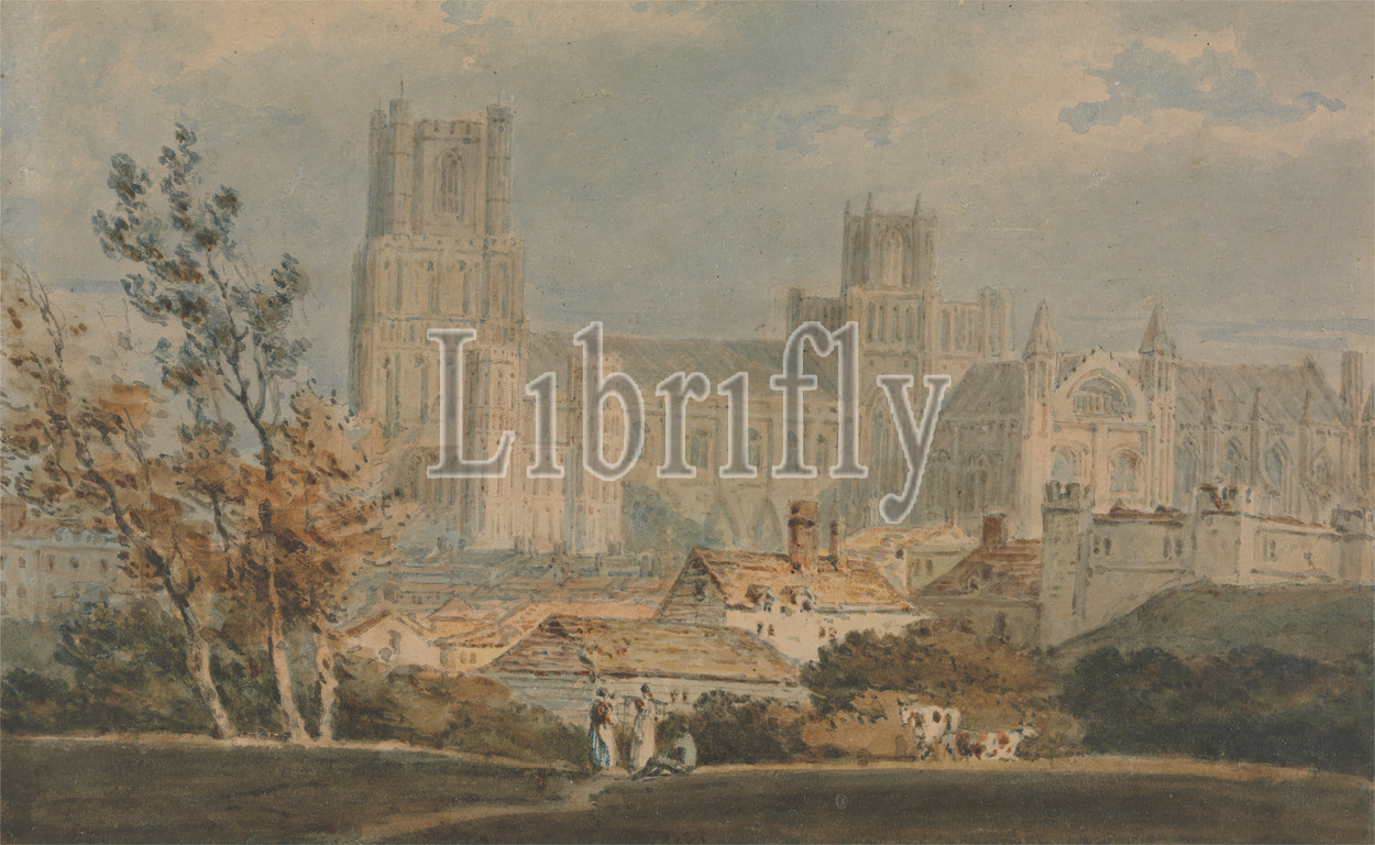 View, Ely Cathedral, Joseph Mallord William Turner, 1775–1851, British, ca, 1796, Watercolor, graphite, medium, slightly textured, cream wove paper, Sheet, architectural subject, cathedral, cattle, clouds, houses, trees, view, Cambridgeshire, Ely, Ely Cathedral, England, Europe, United Kingdom