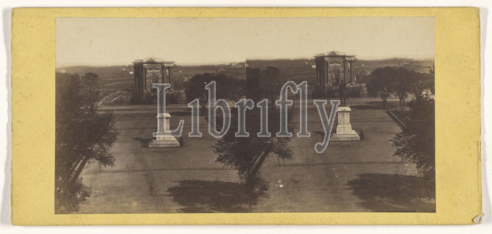 View of a French park, statue and large building in background; French; about 1865; Albumen silver print